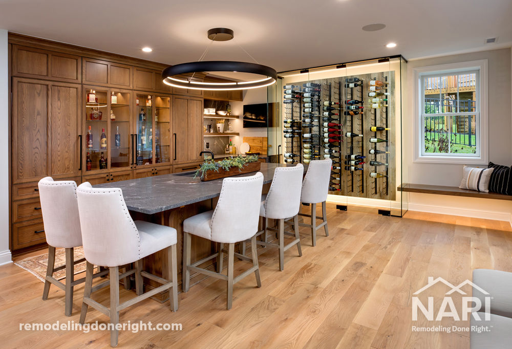 This couple travel often and take an annual golf trip together to visit the best courses around the world. But when they are at home, they entertain frequently. The basement needed to reflect their lifestyle of golf, exercising and entertaining others. High-end finishes abound in this newly remodeled basement, including custom white oak cabinetry, an area to display their bourbon and wine collections, seating for five, and granite countertops in the bar area. The space features an open concept living room and bar, a dedicated exercise space, a golf simulator, full bathroom and home office.