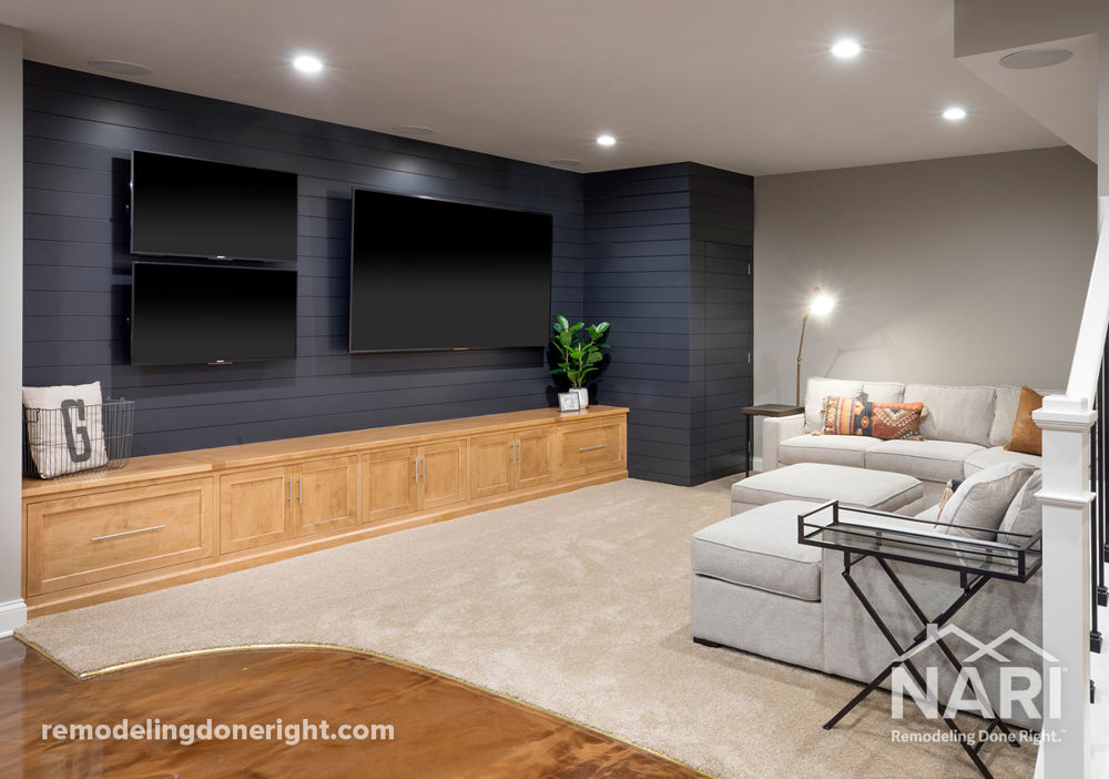 This family of five loves to entertain, exercise and watch and participate in sports. The male client wanted the ability to watch multiple sports at once, while the female client desired an open feel and solutions that made the basement feel less like a basement. By incorporating four televisions, removing a portion of the stair wall and providing a custom bar table vervus bulky cabinets, we achieved both of their requests. The basement includes a family room with three TVs, a home gym, a flex space that currently serves as a playroom, a full bathroom, a bar area and a putting green.