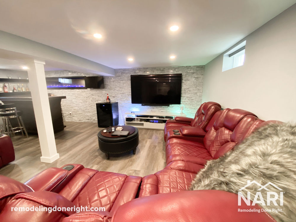 This is a small basement project of only 535 square feet, so designing everything to fit all the desires of the homeowner was the biggest challenge. Creating separation of the different areas without making them look too small or compartmentalized took much customization. Raising the ceiling as high as possible helped create a more open look, so the plumbing design was critical. The spaces includes a full bathroom, a TV viewing area, bar area, a laundry closet, additional closet space and a desk area. A new oak staircase leading down into the space and waterproof flooring were added as well.