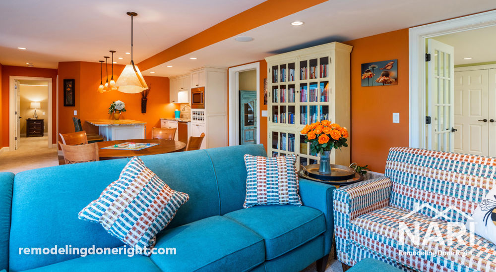 This visually exciting lower level bursting with color was inspired by several Impressionist paintings of Italian village street scenes. The homeowners wanted a media wall, comfy seating, a combination workout room/playroom for their grandchildren, and a larger bathroom that adjoins to the bedroom. They also wanted to maintain the remaining floor plan. The kitchenette and fireplace were updated; gorgeous Mocha River granite became the focal point of the family room. Euro-style painted and glazed cabinetry was installed on the media wall and kitchenette, and an espresso-stained vanity and linen cabinet was placed in the bathroom. Additional custom storage was installed in two rooms as well.