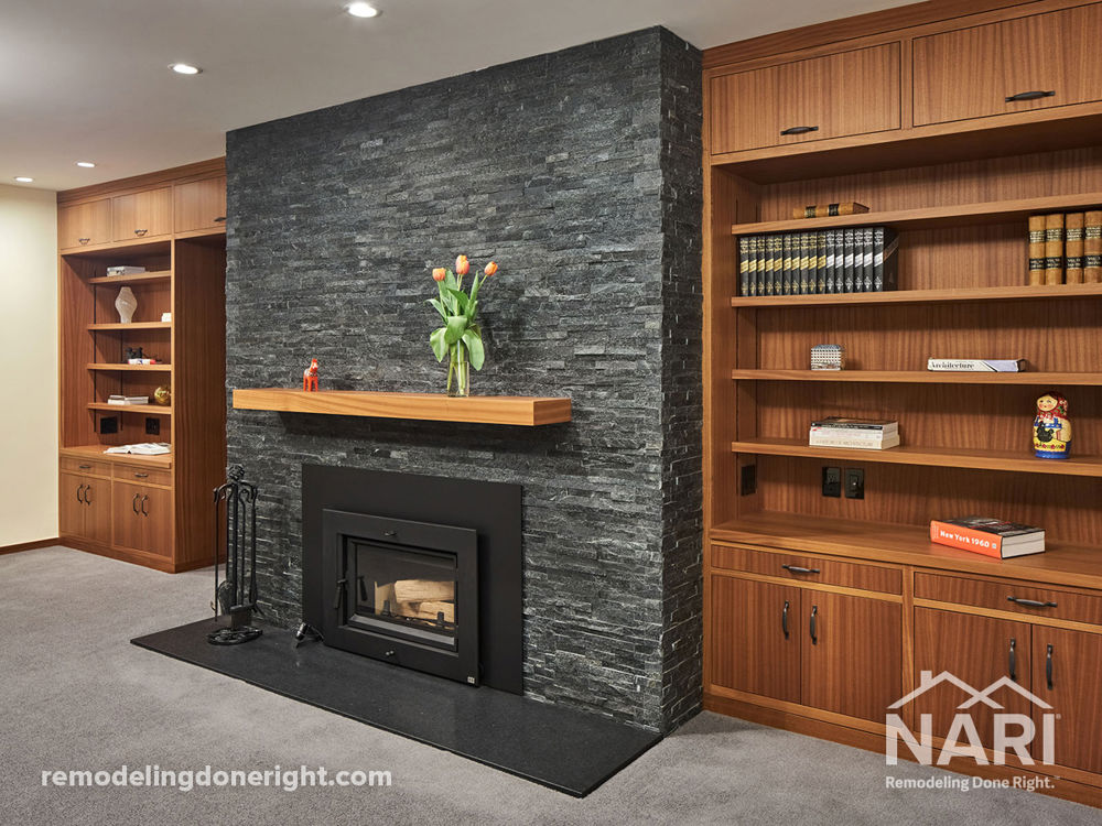 The owners of this 1950s home were tired of their disjointed and generic basement, so the layout was improved to integrate quality materials while maximizing on the natural light and style of the home. The new design boasts a luxurious, functional bath and a stunning new fireplace with built-ins. A practical 'U' shaped kitchen offers an uninterrupted work triangle and generous storage and countertop space. Warm sapele woodwork unifies the basement. The homeowners are thrilled to have a well-thought-out space with rich finishes that capture the character and charm of the home.