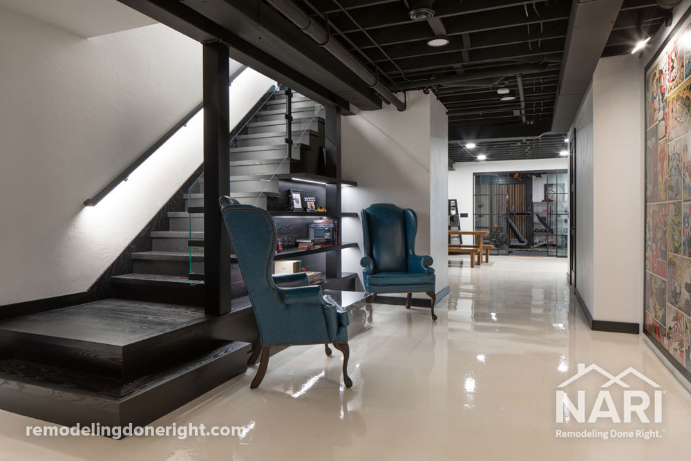 The homeowners wanted their traditional home to reflect their modern aesthetic. Their unfinished basement was a blank canvas waiting to be transformed into a personal gym and sauna/spa, with multi-purpose entertainment space including a home theater and a comfortable guest suite. Lack of natural lighting, a support post that couldn't be moved, a cracked foundation and COVID were the major challenges faced during this project. Work onsite began after the Safer at Home mandate was lifted. A safe work environment was maintained by limiting onsite workers to ensure physical distancing and by using a separate entrance.
