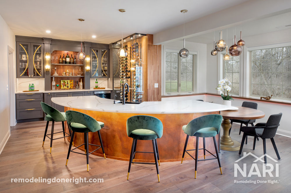 After a recent move from a home with a large, high-end finished basement, this family with three teenage boys, knew a basement was a necessity for entertaining. The design included a unique curved wet bar, multi-TV screens and a workout room. Now that they have the extra room for their family and friends to hang out and enjoy, these homeowners are looking forward to incorporating Art Deco-inspired features, fixtures and furniture into their new basement.
