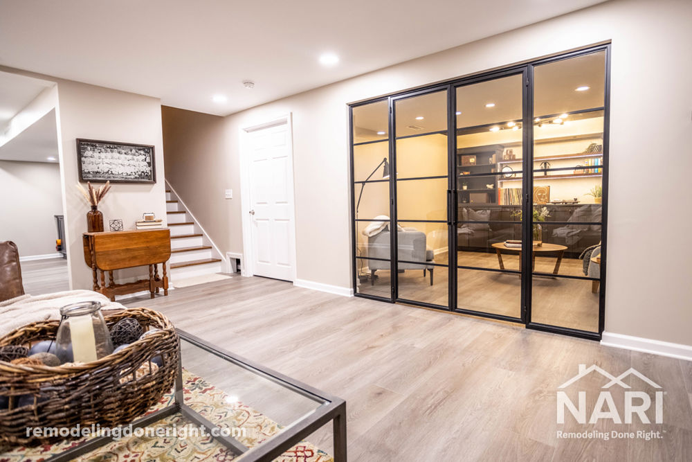 This basement remodel needed to have defined spaces while still feeling open. After replacing the old, unstable stairs, a music room was built with custom glass doors for sound insulation. Mechanicals in this room were hidden and turned into an interesting design feature with a decorative soffit. A dedicated workout studio was included with a beverage center and in-wall water dispenser, making the refreshed floor the perfect spot for every activity.