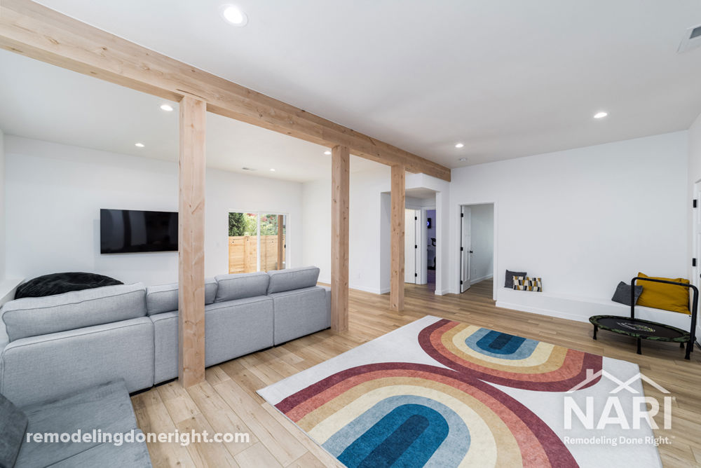 This dreary basement was transformed into an open space that capitalized on light and bright features. With white walls, tiled shower, and sleek, black finishes, this space features a modern look with a balanced, cozy feel.