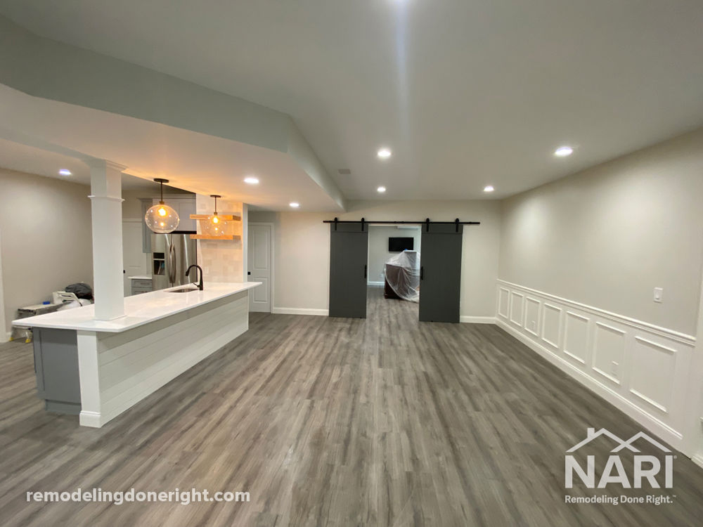 This total basement renovation was completed in its entirety, having started with the home's bare-bones concrete foundation walls. Now, this basement sits at over 1,700 square feet of living space, with 9-foot ceilings, a gym room, a full bathroom with a walk-in shower, and barn doors. Special storage solutions were a must-have in this basement, between the built-in bench seating and the Murphy bookshelf door that leads to a hidden media room.