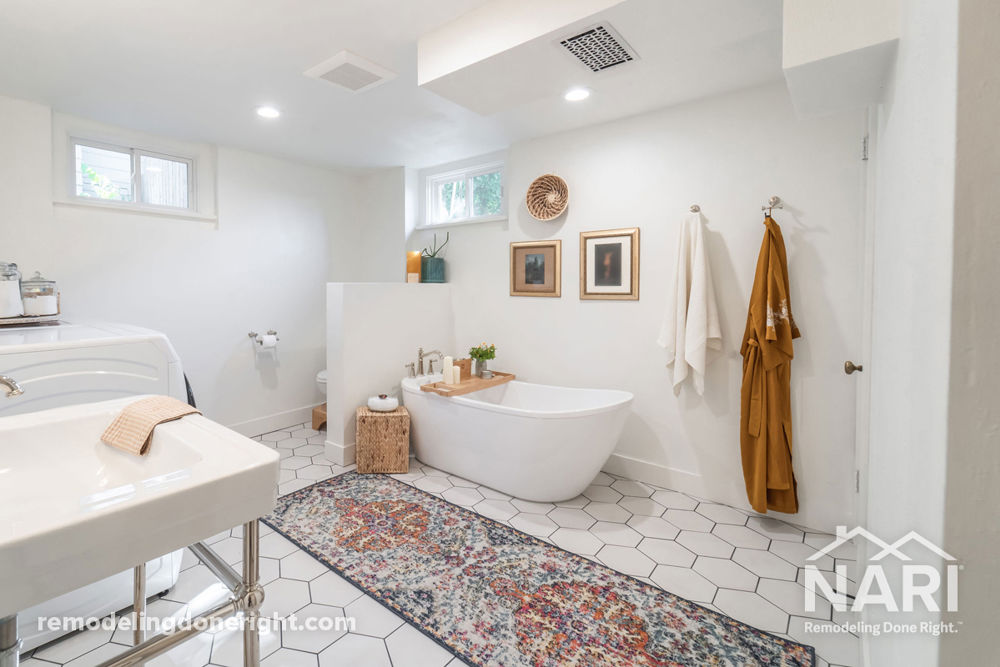 To match the aesthetic carried throughout their 1940s home, these homeowners turned their attention to their unfinished basement. They started by creating a bedroom, bathroom, functional laundry area, and small living room with a fireplace. Little details, like venting registers, were specifically selected to align with the original time period to enhance the new basement's personality and style.