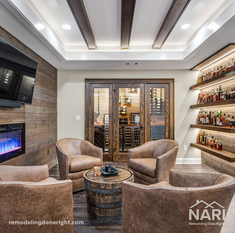 This homeowner wanted to create a modern space for entertaining, especially given their love of wine, bourbon, and cigars. To bring in an urbanized feel, they incorporated reclaimed wood accents, LED Focus areas, and storage for their favorite bottles. A small bar was installed with a kitchen to wash glasses easily and limit trips to the main floor. Twin fireplaces make the area feel extra cozy, perfect for nights with friends or nights together.