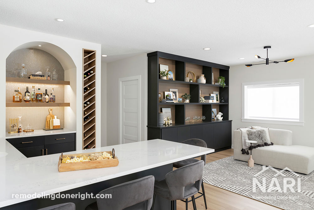 This stunning basement was designed as a high-style space with a contemporary boho-inspired vibe. An exquisite wet bar anchors the entertainment area, featuring ceiling-mounted metal and glass shelving and a beverage center set in a striking arched alcove. The comfortable seating area is framed by a substantial charcoal-painted built-in. The project was completed with an equally stylish three-quarter bath. The entire lower level oozes style and offers incredible hospitality!