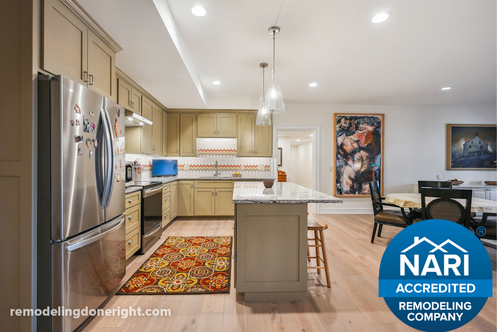 This family needed a complete basement remodel for their new home equippped with wheelchair access and adequate space for an elderly parent. The update created access to a fully accessible bathroom with an elevator, a full kitchenette, and a new wine room for entertaining. The new basement living space connects to a walk-out porch where the family can enjoy spectacular ravine views.