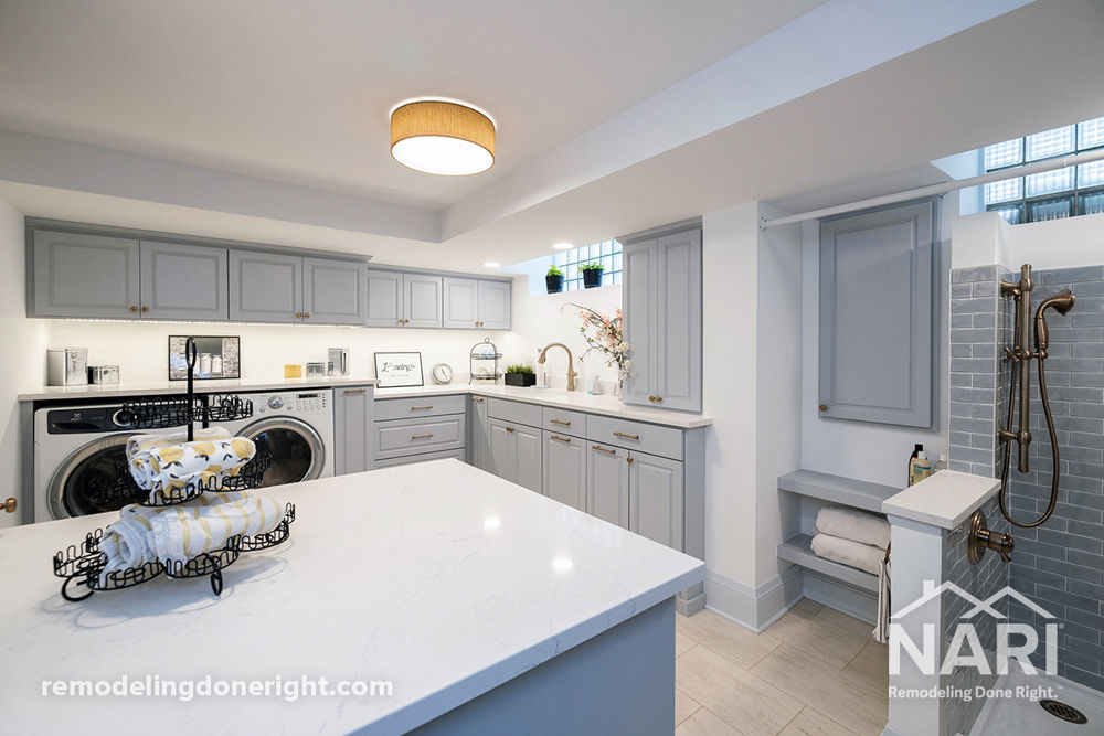 These homeowners desired a more functional layout for prepping and sorting laundry, additional counter space, and custom storage for household and pet supplies in their unfinished basement. As they planned their lower-level renovation, the item at the top of their list was adding a dedicated dog wash to bathe their two Great Danes.