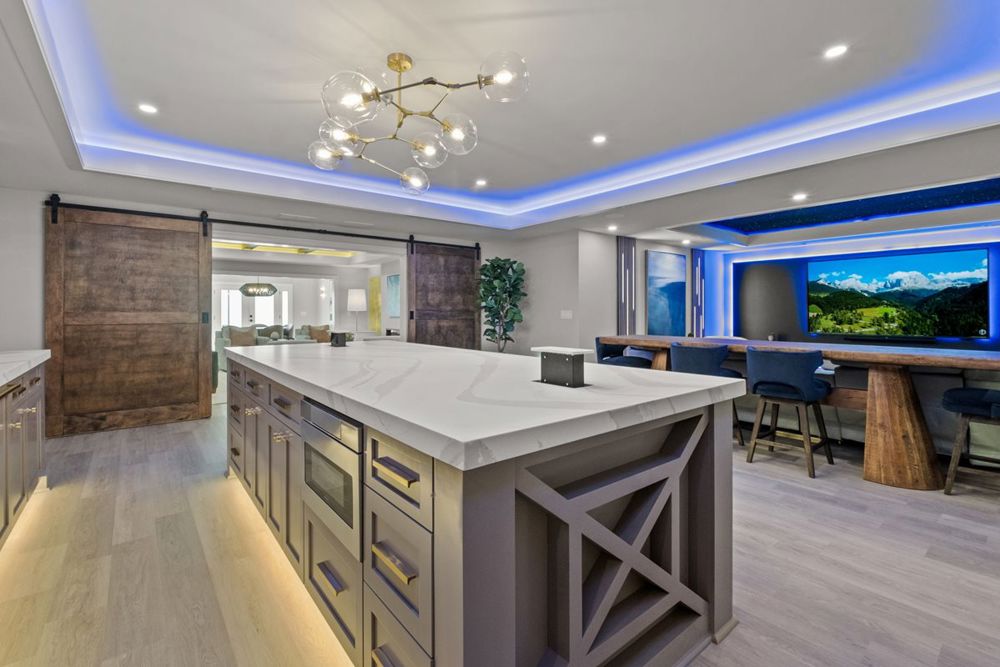 The owners of this beautiful custom home sought to extend their rustic/modern main floor style into the unfinished basement. Their individual styles needed to blend within an open floor plan that could be functionally partitioned, showcasing a theater room with a Starry Night ceiling, a modern speakeasy, a bar, and a wine cellar-all featuring wood slat walls and LED backlit accents. Challenging late-stage scope changes contributed to the project's overall success, including the addition of color-changing LED lights and a control interface for low-voltage illumination. The owners appreciate the various textures and patterns that came together to create their personalized vision.