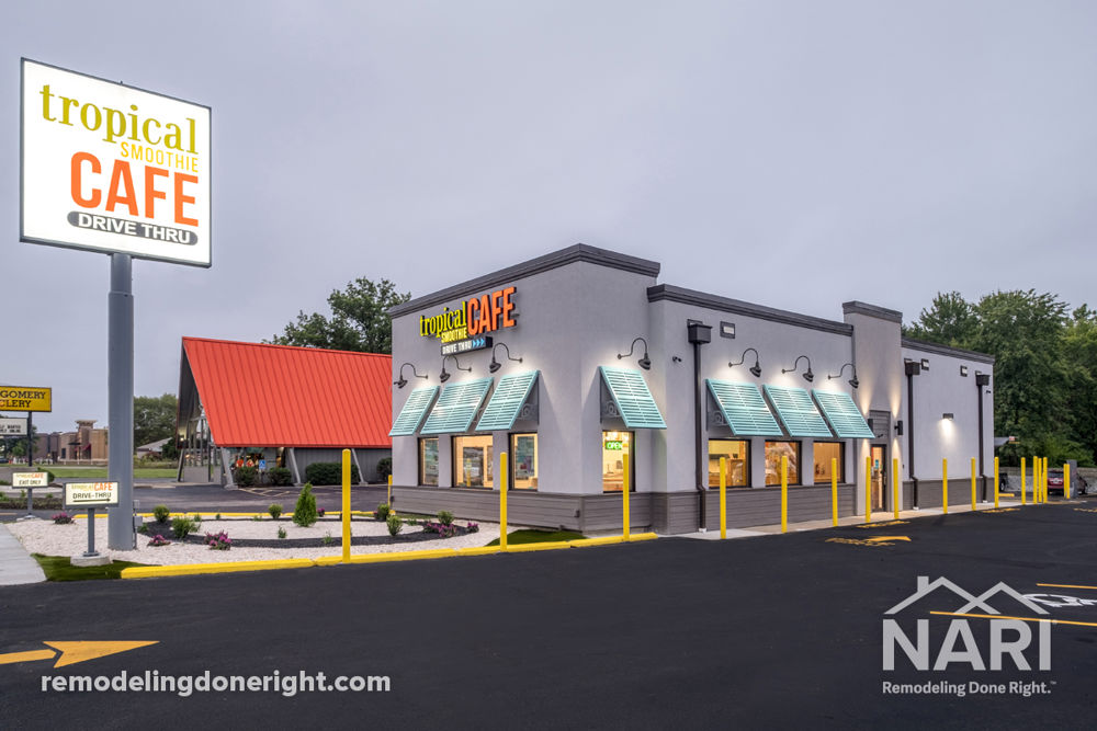 The owner wanted to have an existing restaurant space modified for a new restaurant build-out. This included exterior improvements to a 1960s structure that could accommodate the end user's modernized interior fit-up. The scope of work involved raising the front and side walls; transforming the hip style roof into a flat roof to fit the new design; relocating the HVAC system; and upgrading the electrical service. EIFS and fiber cement board wainscoting were installed on the building to give it a refreshed appearance and feel as well. The changes and updates to the building allows flexibility to grow with the franchisee.