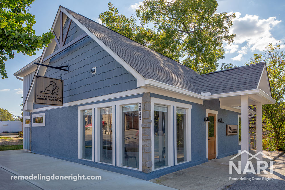 This project transformed a dull, one-story office building from the late 1980s into a warm and inviting cottage. The renovation included extending the roof to create a portico, upgrading the architectural details with white framing trim and siding, and using a coastal blue color palette to brighten up the exterior.