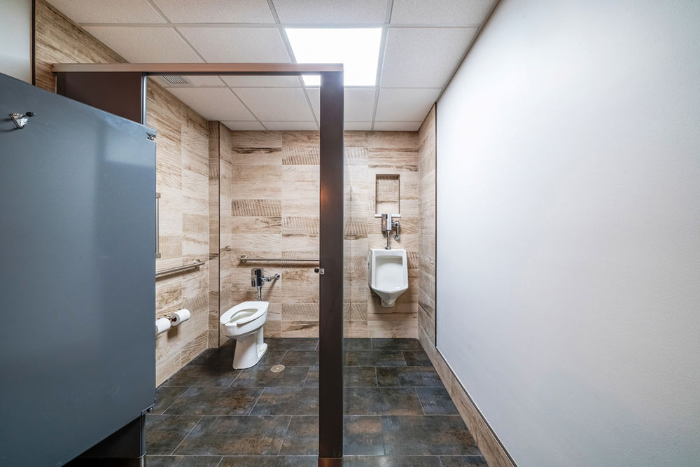 This haggard, dark commercial space required a distinguished bathroom renovation. The previously dingy, outdated bathroom had unattractive small blue tiles, old fixtures, uneven flooring and laminate countertops. The owners desired improved lighting, updated surfaces, hidden storage and new fixtures with an open, modernized feel. The dim bathroom space was converted into a bright, contemporary concept with upgraded fixtures, storage and creative tile designs. The vanity wall is the focal point, with floor-to-ceiling wall tile, extending the tile so that it is visible under the vanity shelf. A quartz countertop and wall cap finishes off the vanity area.
