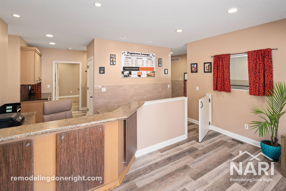 The clients purchased an office space to expand their business, which provides dog grooming, daycare and boarding services. Although the existing office space was relatively new, several specialized modifications were needed to accommodate the business. Special attention was paid to all vertical and horizontal surfaces to meet the durability and safety standards of the clients' needs. Materials like acrylic wall panels, porcelain tile and commercial grade vinyl flooring were used in the heaviest used areas. Multiple accommodations for additional plumbing and drainage for specialty grooming equipment and dog care were needed. Custom boarding kennels were designed and built onsite to ensure the safety and security of dogs overnight as well.