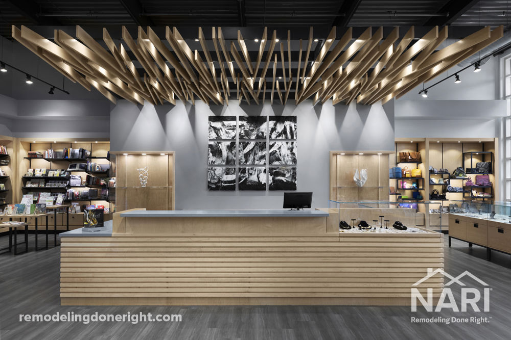 This art museum's original gift shop was more thrift store than an exclusive shop offering one-of-a-kind gifts. The new gift shop can now act as a standalone retail destination, or as an extension of the art museum experience. It is welcoming, energizing and a place to linger. Shop items are highly visible and easily featured on the display units. Art is in every design element, especially the handcrafted central customer service desk, which includes lower counter-space for accessibility, and the floating canopy above it. This modern, bright welcoming gift shop will continue to inspire and entice museum visitors for years to come.