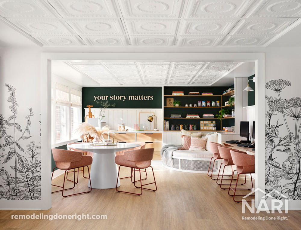 This girls' shelter needed renovating to not only meet the girls' everyday needs but to also feel like a warm and comforting place to land. For this project, expanding the dining room and adding windows brought in more natural light. Opening up the living room provided a natural flow into the activity room where built-in desks, a reading nook, and an art table were added. Any used space was opened up and reconfigured, along with adding in plenty of storage, and updating all bedrooms, bathrooms, and office spaces throughout.