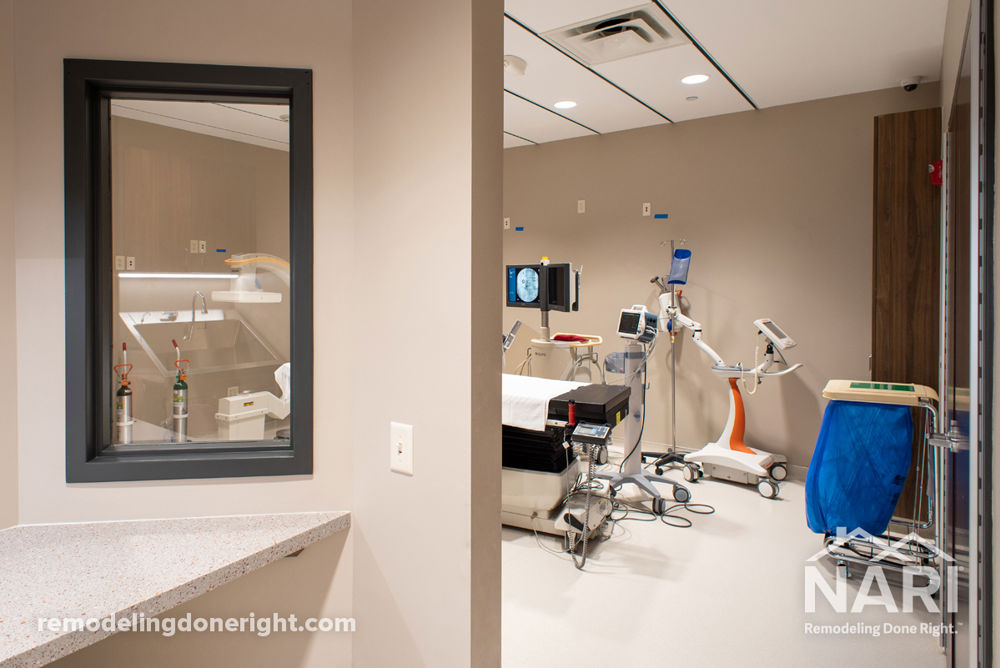 The purpose of this remodel was to obtain accreditation for a neurosurgery office to meet the new codes of the Accreditation Association for Ambulatory Healthcare. Separate patient corridors were created to limit traffic into sterile corridors. Heat-welded flooring with cove base was installed to create a sterile substrate. HVAC was altered to incorporate positive air pressure. An acoustical tile grid was converted to drywall ceiling. The entire facility was fire-rated. A portion of the existing lobby was built out into an additional exam room. Timing was key when shutting down mechanicals to ensure the facility was functional within their patient schedule.