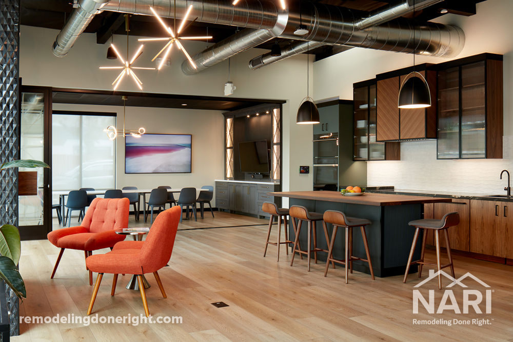 A regular concrete tilt-up building has been transformed into the headquarters of the Bay Area's leading Design + Build renovation firm. The office has been updated with new cabinets, flooring, and countertops. It provides an immersive educational experience for clients interested in remodeling their homes, showcasing various cabinet and countertop styles, flooring options, tile patterns, lighting, and paint finishes.