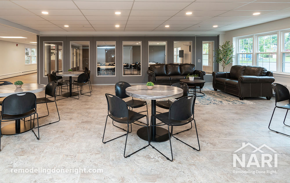 A local church rooted in community, group teaching, and public outreach, sought to modernize their dated building to accommodate their expanding congregation. They desired spatial flexibility for both small and large groups; from wedding receptions to small religious ministry, sound management, and a centralized caf� for gathering. By employing moveable interior partitions, flexibility combined with sound attenuation was achieved. The design offers a large spatial footprint that can be sub-divided into two smaller classrooms with a lounge and coffee bar. Code compliance for fire and ADA inclusive of an accessible ramp, elevator, and updated restrooms completed the building transformation.