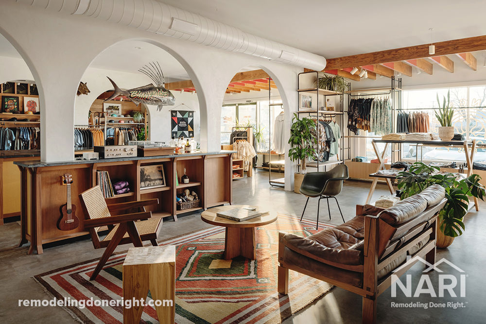Inspired by vintage guitar amps, existing archways reminiscent of south-of-the-border destinations, and natural materials reflecting the client's brand, the remodel of this 2,100sf space was about editing and telling stories. After demolition, old Doug-fir wood joists were discovered above the storefront display. They were the cantilever back-spans for the exterior awning. Instead of covering them back up, the designer chose to expose them, treat them with a red accent, and drywall carefully around each one. Adventure, texture, authenticity, and delight are hallmarks of this men's clothing brand, which were adopted for this crafty and colorful build.