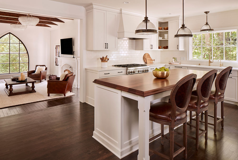 This 1930s home had been gutted by another contractor who did not properly demo the house and eventually left it in disarray. The homeowners needed to make it livable for their young family, and they desired spaces that would reflect their style and acknowledge the era of the home. Now, the spaces are conducive to daily life and entertaining. The remodel features new hardwood floors; a family room with a vaulted ceiling, beams and a restored church window; a den with a linear gas fireplace; a functional kitchen with a cherry island top; and a large master suite.