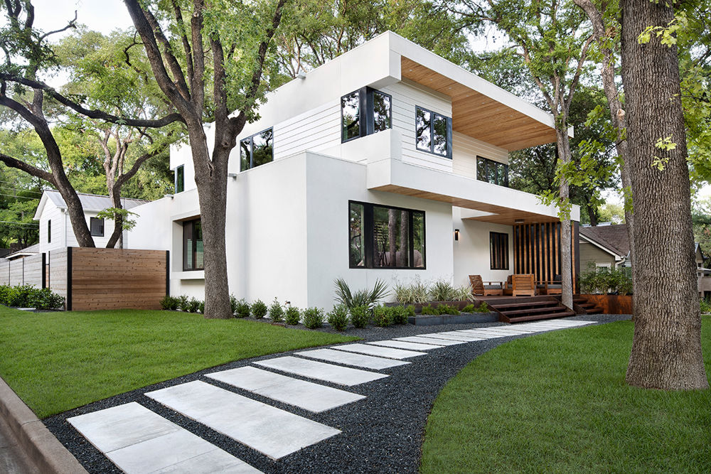 This single-story home in Austin, Texas, received a transformative whole-house renovation and addition. The family of five sought a modern and efficient design that reflected their lifestyle and provided them with the space to grow. The existing roof was removed and the exterior envelope re-imagined. A second story addition elevated the home into the dense tree canopy. The interior spaces were reconfigured and refinished. The new outdoor spaces engage the neighborhood and take advantage of the beautiful trees. Minimalist detailing and challenging modern craftsmanship throughout allow spatial harmonies to sing.