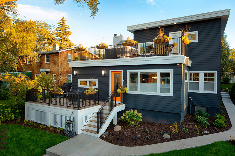 The team made some significant, yet sensitive changes to this 1952 midcentury-style home. The entire exterior was updated, while maintaining half of the existing roofline and expanding the second floor with a contemporary flat roof, thus increasing the square footage on the second floor. The rear expansion involved changing a jalousie porch into an expanded dining room and kitchen. The flat roof over this area hosts an upper deck, perfect for private entertainment. Structural finesse with hidden steel beams supporting this allowed for an open plan in lieu of the existing small rooms.