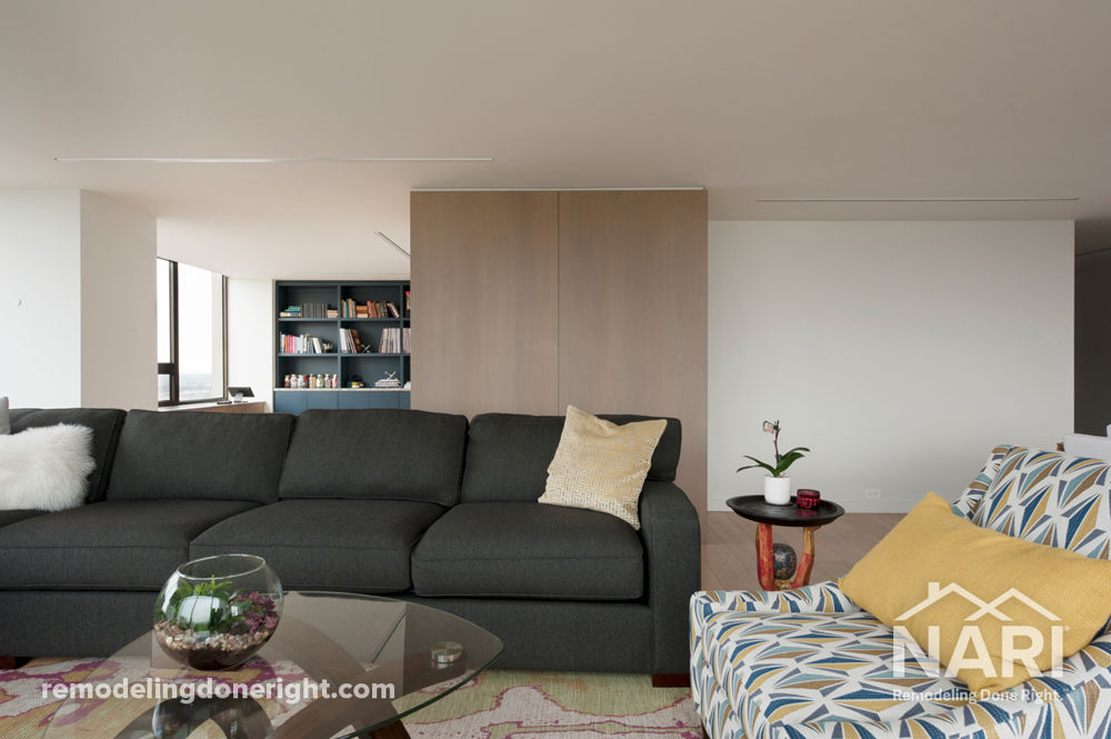 The scope of this project involved combining two separate high-rise apartments into one, capturing a full 180-degree panorama of Chicago's skyline and lakefront. The interiors of both units were gut rehabbed and the floor plan substantially altered to create a single functional apartment with a contemporary aesthetic. Scope items of note include the installation of wide-plank hardwood flooring, custom millwork and stone, high-end lighting systems, a commercial-grade kitchen, luxury bathrooms, complex tile installations and a smart-home system. Exceptional craftsmanship and project management overcame the challenges of high-rise construction to produce a spectacular luxury residence in one of America's greatest cities.