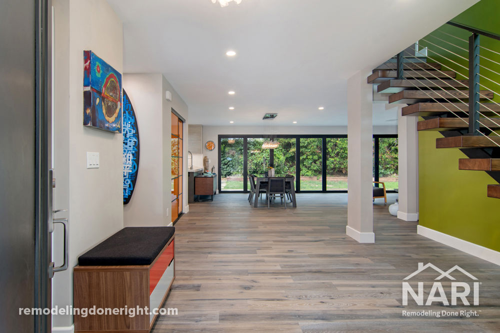 This extensive whole home remodel for a family relocating to a new city transformed outdated style and a cramped layout into a stunning haven. The clients' love of art and emphasis on welcoming friends into inviting surroundings are evident throughout their new home design. Elements of color and texture convey a sense of coziness for a comfortable family lifestyle in a thoroughly modern design. The kitchen was relocated and walls were removed to create a more expansive space. Multiple new windows and glass doors open the home to the backyard and abundant natural light. Bright hues and interesting patterns balance with clean lines for welcoming warmth and style throughout this home.
