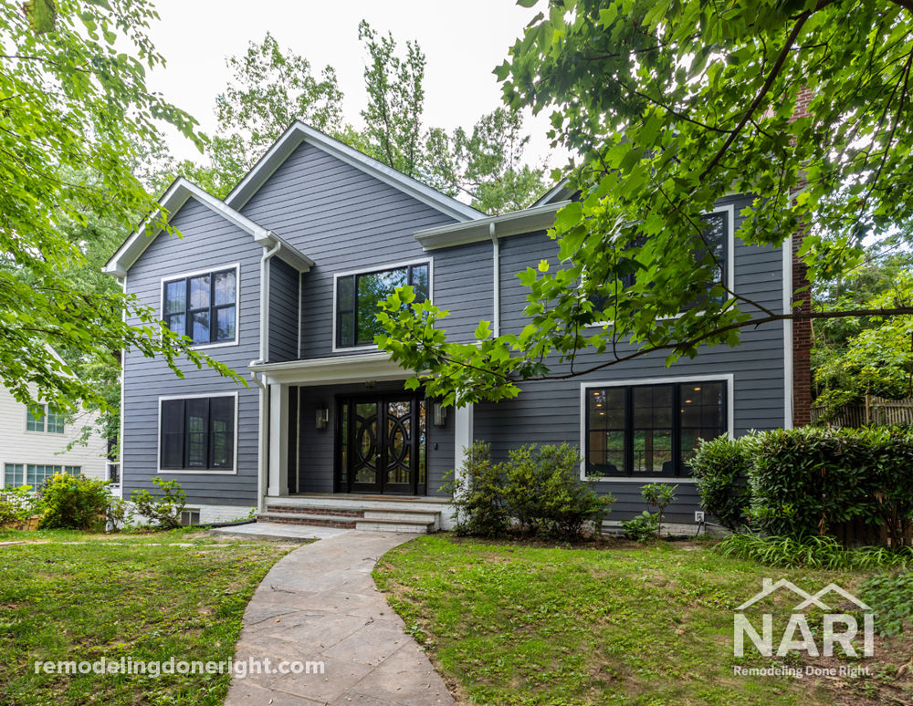 The homeowners wanted a larger-scale, two-story home with contemporary amenities and an Arts Craft exterior. A new second story with four bedrooms, three full bathrooms, and laundry room was added over the old structure. The first floor was redesigned with an open layout, and new staircases to the second floor and basement. A single car garage was added to the left of the house with an upper side balcony off the study room. The entire exterior was updated as well and includes a new front porch with a custom made black door and metal roof. The basement was totally revamped as well.
