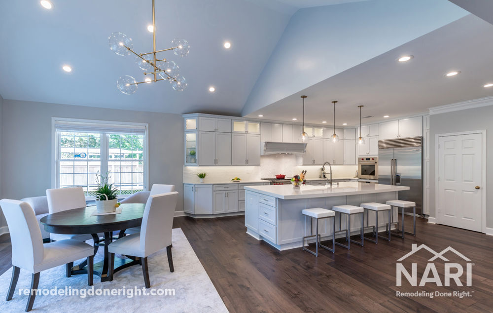 This couple have lived in their single-family Ashburn home for a while. They wanted to update their small and dated kitchen, add a sunroom/breakfast area, add an outdoor patio next to the sunroom, renovate the powder room, and two upstairs bathrooms. A 300-square-foot addition made room for the sunroom / breakfast area. The removal of a bearing wall adjacent to the family room and big closet also helped expand the kitchen. Wide plank espresso hardwood flooring matches the adjacent rooms. The master bath upstairs was enlarged by taking 2 feet from the bedroom and features large scale Carrara look porcelain tile.