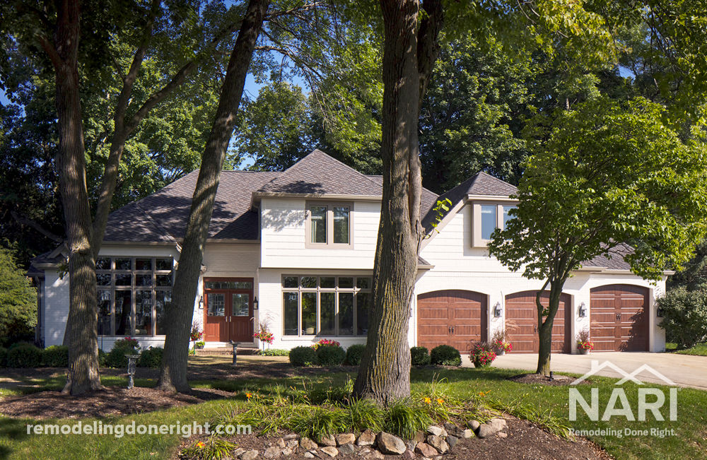 More money had been put into the grandeur of this 1990s home rather than quality finishes. The homeowners desired spaces that not only functioned better but also had more character. The home's exterior was updated with lower maintenance materials. An addition was built to create extra space off the kitchen and accommodate a larger laundry room. Details include a coffered ceiling, crown molding, paneling, a custom hickory floor, and built-ins, adding charm to the interior. The remodeled kitchen now serves as an entertaining hub and boasts double islands, custom cabinetry and a better connection to other spaces.