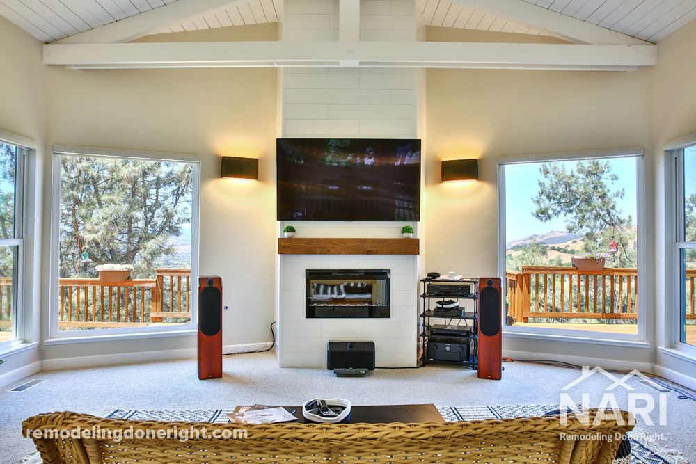 The clients loved to entertain but felt like their home wasn't built with that in mind. By removing a load bearing wall, the kitchen, dining and living rooms were opened up. In the kitchen a recessed exhaust hood was installed to maintain the beautiful view of the valley. The master bathroom was also reconfigured to better utilize the space and give the clients a spa-like feel. All the windows and flooring in the home were replaced and a smart home upgrade added with smart lights and fans.
