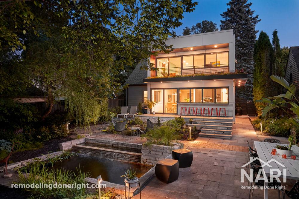 Cozy, story-and-a-half homes in this area are filled with Cape Cod inspiration; each one of them leaving you wishing those ceilings upstairs would back off -just a little. This project reclaimed unusable space and includes a 10-foot-by-20-foot addition. The modern design incorporates a flat roof to maximize every square foot on the inside, and adds an outdoor oasis. Beautiful stone patios, wood grain soffit, and a bar top that makes you feel as though you never left the kitchen make this home uniquely inviting, inside or out. The space features a large kitchen addition and second story ensuite with balcony.