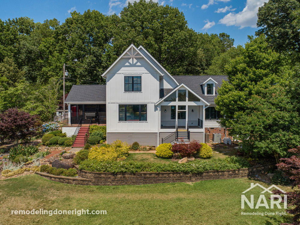 The homeowners purchased this home for its stunning lakefront lot, but the residence did not fit their lifestyle or aesthetic. Outdated, with limited views of the water, this home needed to be redesigned from top to bottom. A second story was added to include two new bedroom suites and walk-in storage. On the first floor, walls were removed for better flow and light, a brand-new kitchen and dining area created, and a family entertaining space designed to maximize lake views wherever possible. A covered porch with fireplace and lake views was also constructed.