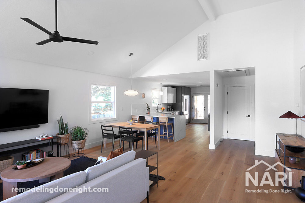 The homeowner was their own designer who had a strong vision for creating a modern and breathable space. The biggest structural obstacle was that the living room and kitchen walls and doors prevented the house from flowing and circulating correctly. To solve this, all walls in the living room and kitchen were removed and an overhead structural beam installed. The ceiling height was raised to create a vaulted ceiling using attic space. In addition, the kitchen wall was closed off and the space reallocated for a bathroom closet and stackable washer and dryer. A new kitchen was extended over an existing patio.