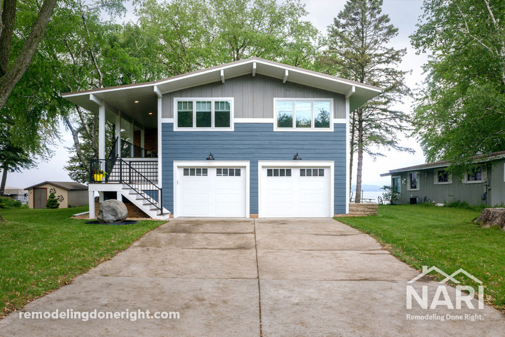 This 1960s, two story, 2,835 square foot lakeside home was transformed inside and out, with everything updated or replaced except two great room windows, the exterior chimney and stone accents, and interior fireplace stone. Everything old and dark was transformed to fit a bright and modern design aesthetic with a balance of rustic features and clean lines. Creative design maximized lake views on both floors. A new master suite, office, second guest bedroom, functional storage and a second bathroom was added and the bar expanded-all within the existing footprint of the home.