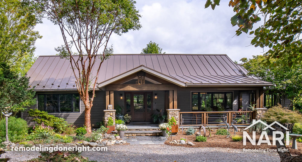 This whole house renovation began when the owners decided to renovate, rather than relocate, to remain on the property they had spent years cultivating. The home interior features subtly nuanced warm and cool neutrals with quartersawn white oak flooring and beams, providing a modern but inviting atmosphere. The exterior features exposed sapele beams, stone, and other natural elements. Wide spans of tall windows, along with a network of decks with cable railing, allow for ample views. What started as a simple gable house with small, dark rooms is now a spacious and light-filled retreat overlooking the grounds.