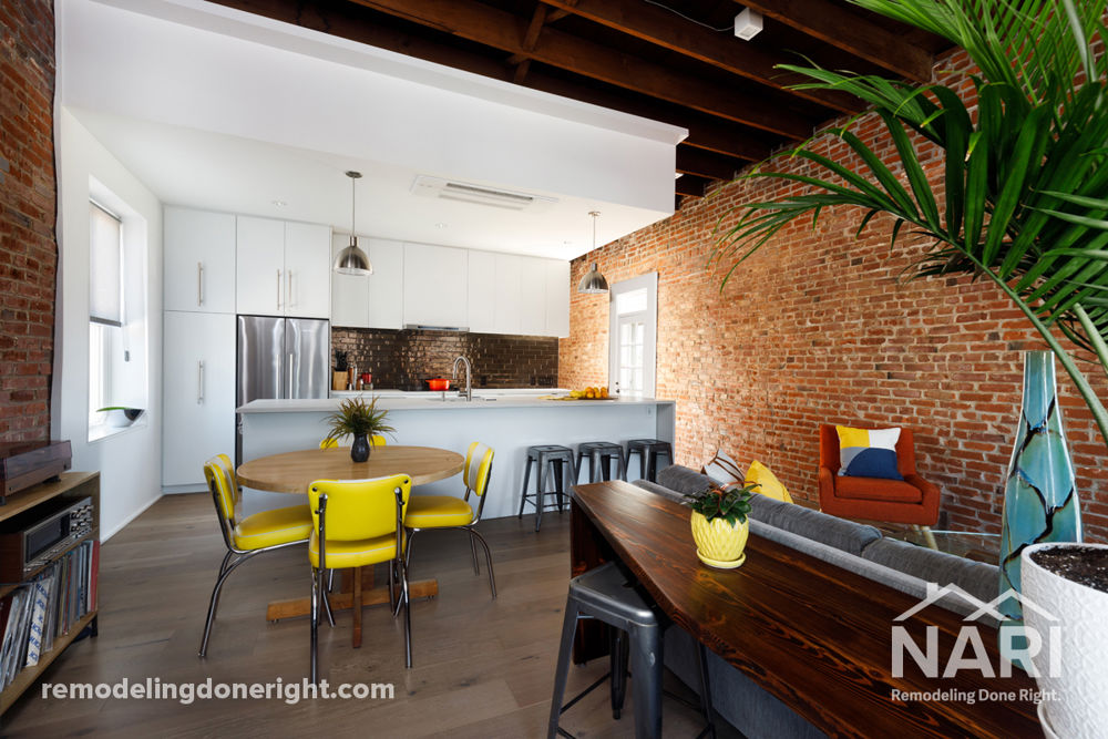 These homeowners had a clear vision for their home: a living area with open spaces and better traffic flow. With exposed ceiling beams and brick walls, their design calls for modern materials and finishes, including custom interior trim and cabinetry details.