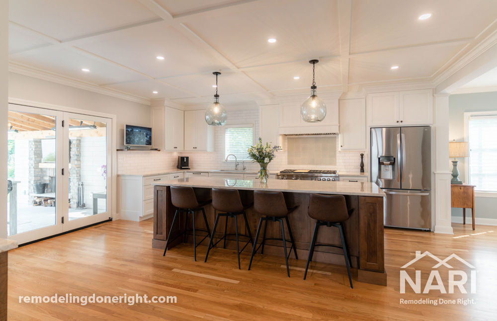 These homeowners had a passion for family, entertaining, and cooking, and wanted their new space to reflect that. Reworking the entire first floor floorplan allowed for an open concept consisting of a large chef's kitchen, a new full bath, pantry with built-in storage, enlarged family room, and open dining room finished with a wet bar. A fireplace was added outside, along with additional seating and dining space, providing ample room to marry all of their favorite things in one space.