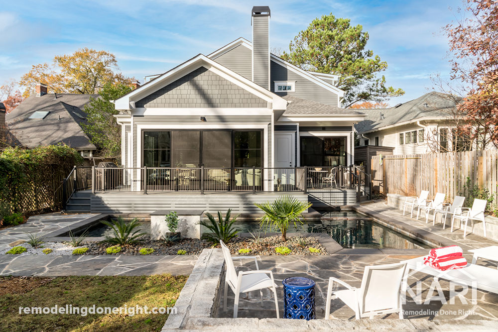 This transitional cottage renovation maintained its original integrity, and accommodated visits from the homeowner's children and grandchildren. To account for the expanding family, the back of the home was extended to create additional space in both the living area and kitchen. With new soft finishes, the living room has an open feel, designed for gatherings. The kitchen, with its soft color palette, lends an airy and inviting feel for the whole family. And an eclectic bathroom is sure to be a head turner with its eye-catching wallpaper and mesmerizing symmetry.