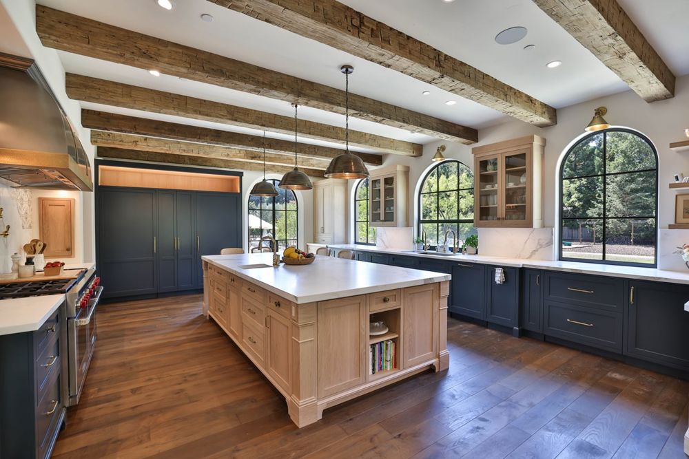 This French countryside-inspired whole-home remodel and addition significantly enhanced the home's function, style, and appearance. The open layout, featuring large arched windows, maximizes natural light and seamlessly connects indoor and outdoor spaces, creating a warm and inviting ambiance. The use of centuries-old reclaimed materials alongside custom hand-built cabinets, railings, doors, and windows adds a contemporary touch while maintaining a classic aesthetic. The addition of 1,200 square feet and the reconfiguration of the existing home not only improved the flow and functionality but also reflects a refined, sophisticated design that complements the architecture.