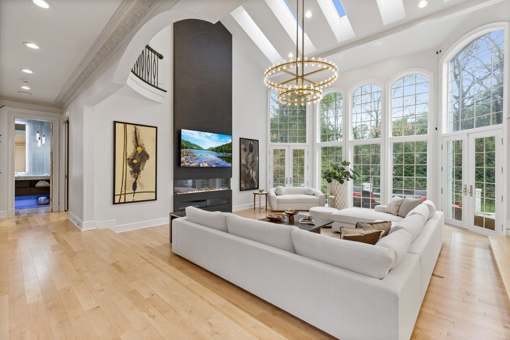 This McLean Mac Mansion underwent a striking transformation, emerging as a functional, luxurious home. The outdated, partitioned kitchen was expanded by six feet to include two large islands, professional-grade appliances, and a 12-foot picture window with breathtaking views. Additional features included a dirty kitchen, mudroom, and stylish powder rooms. Walls were opened to enhance flow, and a sleek linear fireplace, custom windows, and wide-plank maple flooring were installed. Elegant wrought iron doors, upgraded stairs, and luxurious lighting completed the overhaul, resulting in a modern, open-concept home seamlessly integrated with its stunning five-acre outdoor setting.