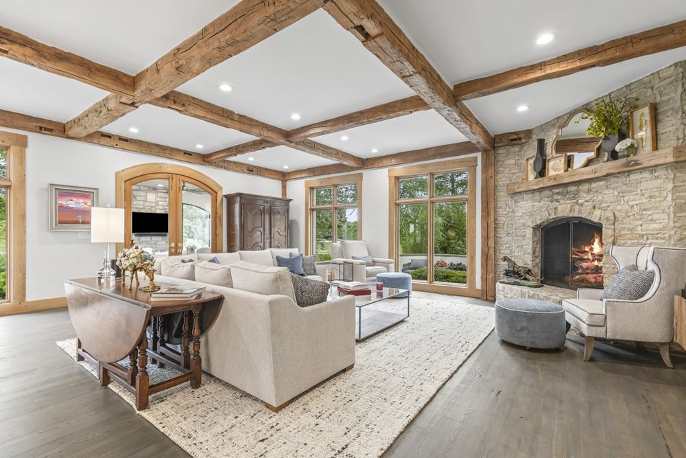 This 8,000-square-foot French Country home underwent a full remodel from October 2023 to May 2024. Key updates included reconfiguring two kitchens, adding a butler's pantry/laundry area, and renovating six bedrooms and 6.5 bathrooms. The first and second floors were updated from stucco to smooth surfaces. The finished basement now includes an exercise room and a full bath/steam room. Rustic French Oak trim and historic barn beams were preserved, while new electrical, lighting, flooring, and appliances were installed. Outdoor improvements included refreshed landscaping, gas lamps, painted stucco, and limestone enhancements for terraces and steps.