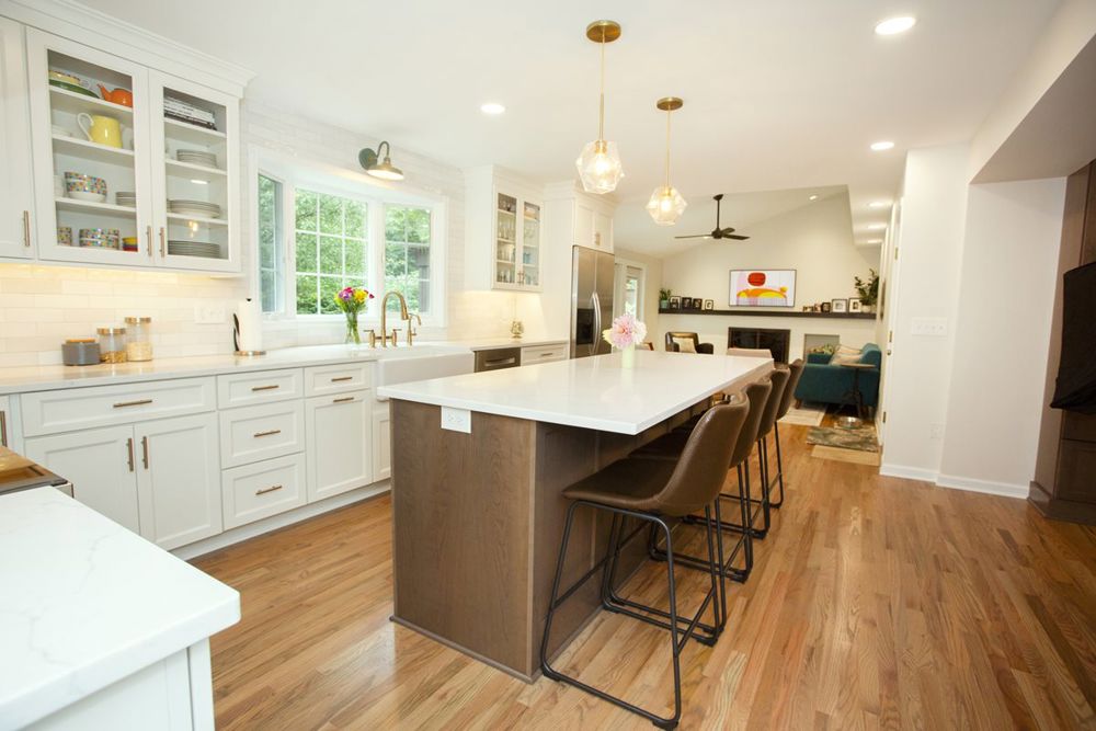 This young family wanted to improve the flow of their 1978 home to suit their modern lifestyle. With a budget of $250,000, they aimed for an open-concept layout and a front porch addition. The new plan creates a family kitchen and living area, incorporates hardwood flooring, improves natural lighting, replaces exterior doors, and extends the outdoor living space. These goals were achieved by removing two interior walls, upsizing the kitchen, and opening it into the family and dining rooms. The new spacious front porch provides a welcoming outdoor gathering space and enhances the home's charm.