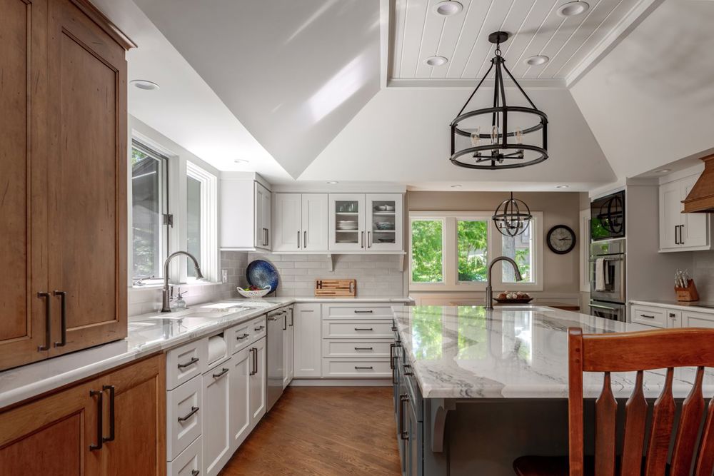 The scope of this project included updating the entire interior with new paint and refinished flooring, upgrading all fixtures and finishes, and redesigning the stairs and hand railing. Remodeling improved function and flow in the entry, kitchen, laundry, powder room, dining and living areas, primary bath, and walkout basement, which now includes a bathroom, family room, two offices, a play therapy space, and a bar. A neutral aesthetic enhances views of the golf course.