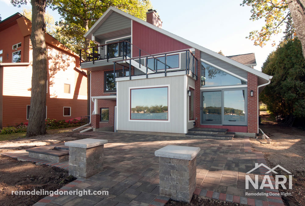 This project consisted of remodeling a small tri-level lake home, built in 1942. The homeowners had dreamed of a light-filled retreat that would take advantage of the lake views and be as green as possible in its creation. This project took reduce, reuse, recycle to a new level with much of the home's original elements being set aside and repurposed in new, inventive ways. The home was expanded with the addition of two bathrooms, a master bedroom suite with walk-out lakeside decks, a yoga room, an open concept living room and kitchen on ground level, and a new, detached three-car garage with heated workshop.