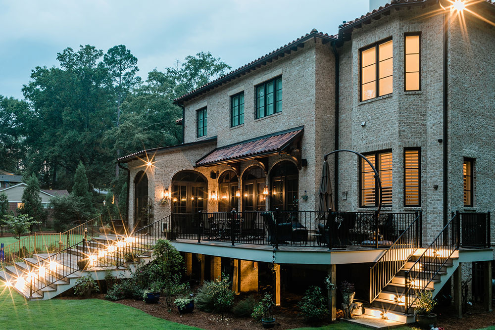 The clients desired a low maintenance deck with a grand, wide staircase into the backyard. Their existing narrow deck did not span the back of the house, which resulted in a set of French doors with no landing space. The new deck features gray Birch composite decking placed at a diagnonal with a picture frame border, and fortress iron handrails. The 28-foot wide grand staircase provides easy access into the backyard. Additional green solutions include LED lighting, and PVC white trim at the perimeter of the deck. Now the clients have a well-designed and well-lit outdoor oasis.